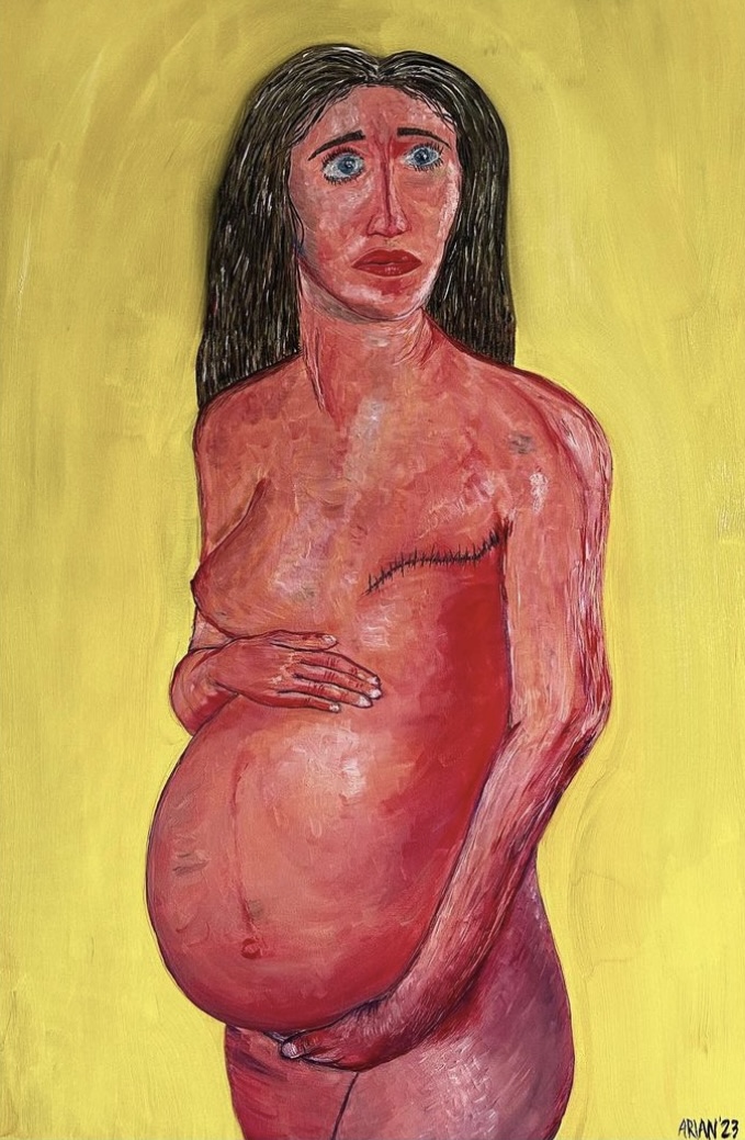 At the beginning of each year, I always try to paint something joyful. But there we are, with a pregnant woman who got a mastectomy. What is going on in her mind? Ok, it is not joyful. But it brings hope. Life did not stop for her.